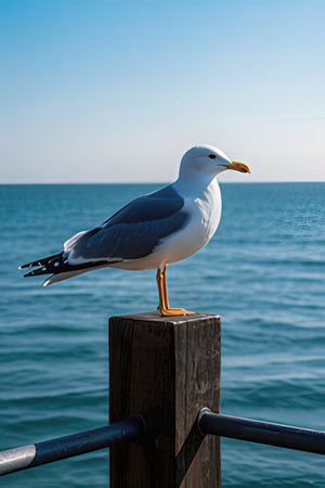 A seagull stands on a white fence. Portrait of a seagull on a background of blue sea, close-up view.