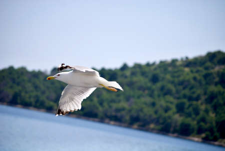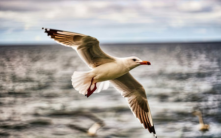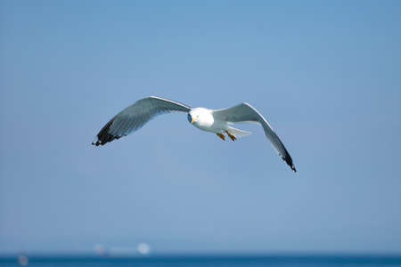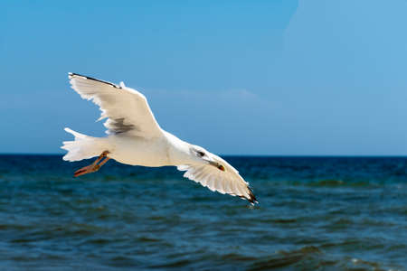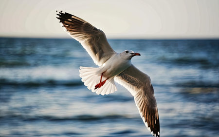 Seagull in mid-flight with wings spread wide, gliding gracefully over the deep blue sea on a sunny day.
