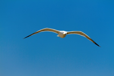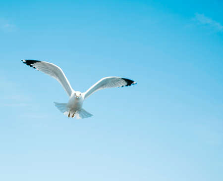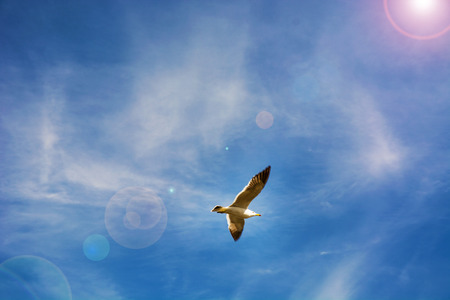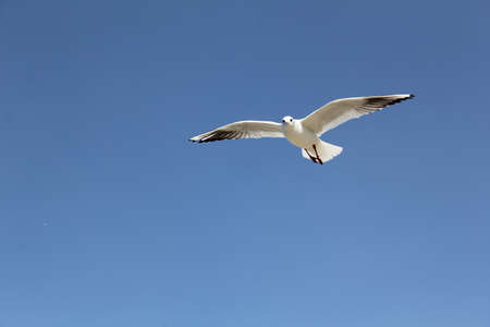 Seagull flying in clear blue sky at sunny summer day. Panoramic view.