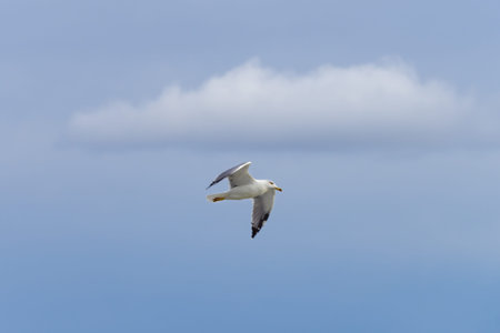 Single seagull flying in a cloudy blue sky as a background
