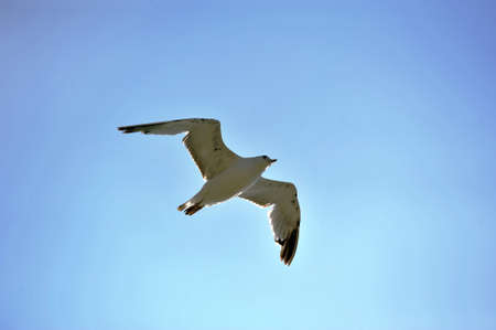 Single seagull flying in a blue sky as a background