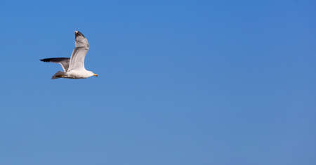 A beautiful white seagull soring high in the blue sky, horizontal with copy space