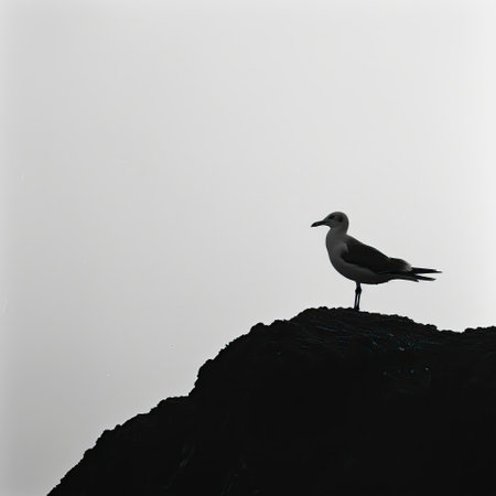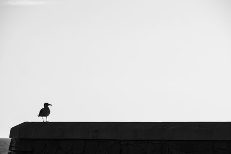 monochrome seagull walking past its shadow in monochrome minimalism.