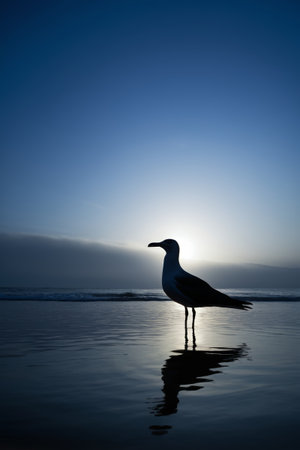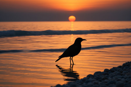 A silhouette of a seagull on the beach with the beautiful sunset in the background