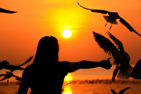 Silhouette of a girl feeding birds at the seacoast in twilight sunset background
