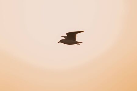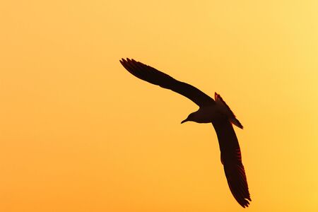 Flying seagull on the clear sky at sunset. freedom theme.