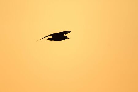 Silhouette of Common Terns on red sunset Sunset Sky. The Common Tern (Sterna hirundo). in flight on the sunset grass background. Sunrise Backlight seabird of the tern family Sternidae