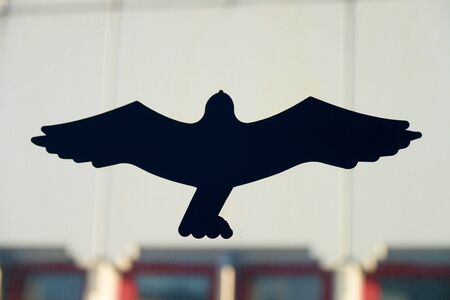 Protectionfor bird from hitting glass. Sticker of bird predator glued on glass window. Collision prevent.