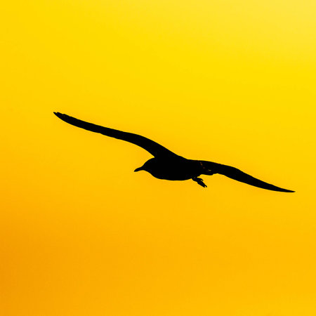 silhouette of a flying seagull in the sky at sunset