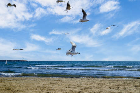 Seagulls flying over the sea waves. Seagulls on the beach of Olimp on a cloudy and stormy day, Romania.