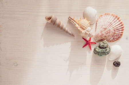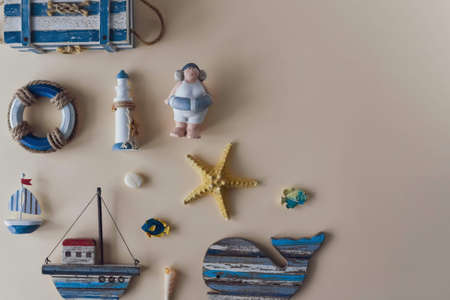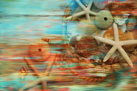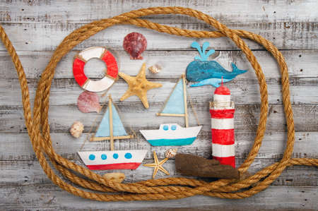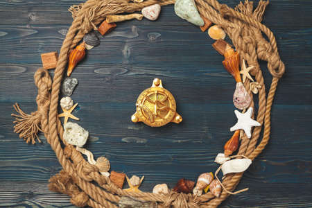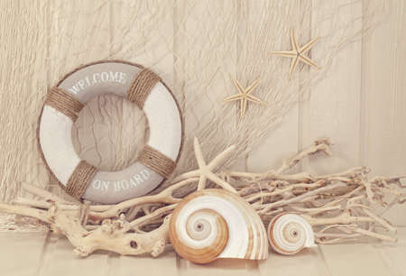 Nautical life style items: sea shells, fish, rope, lifebuoy. Marine concept.