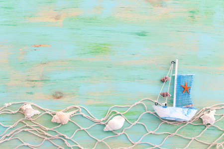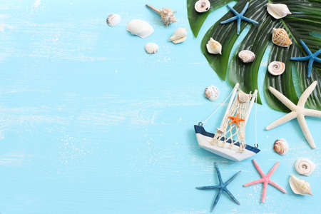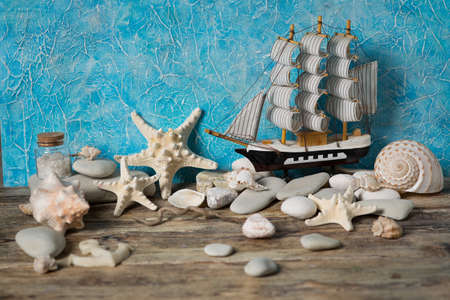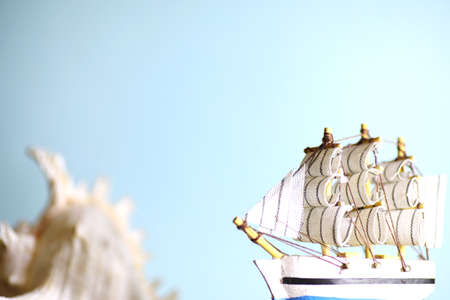 nautical concept with white decorative sail boat, seashells over blue wooden background
