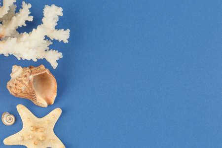 Beautiful seashells lie in a row on the left side of the frame on a blue background. Space for copy.