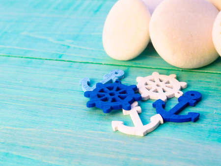 nautical decor with a helm and an anchor, on a white texture, surface, space, travel, vacation.