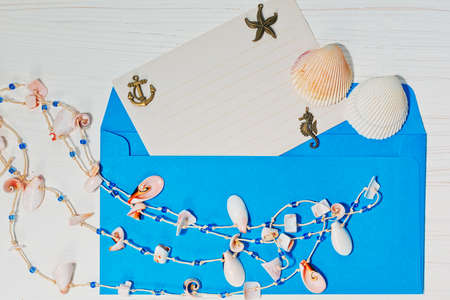 Concept with holidaymakers letter in blue envelope and different sea shells