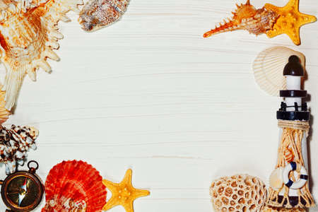 Plank wooden background in mediterranean style with sea shells and lighthouse and vintage compass - horizontal top view