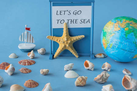 Globe, starfish and shells on a blue background with typography Lets go to the sea.