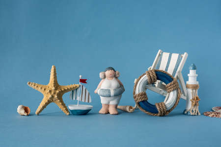 Various decorative nautical items, seashells, sea stars and miniature toys on blue pastel background. Sea travel, summer vacation at ocean concept. Flat lay, top view.