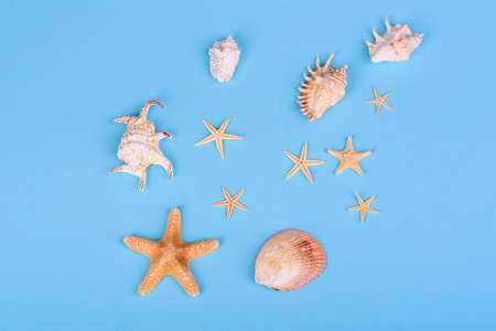 Starfish, seashells on a light blue background. Sea souvenirs. Vacation concept. Flat lay, top view, copy space for text