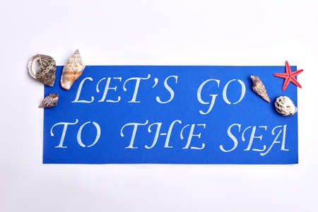 Blue paper inscription with sea concept. Note with sea shells on white background.