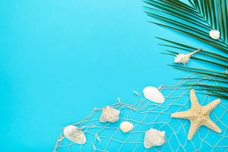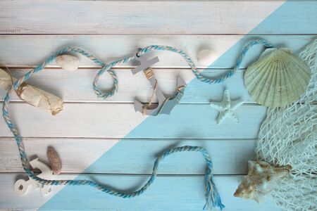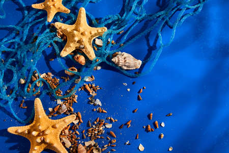 sea ​​shells, anchor, blue cord, white fishing net, starfish, pebbles, still life, summer vacation concept, trip to warm places, travel