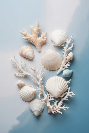 Shells, pebbles, coral tree on a pale blue background. Banner. The concept of a tropical holiday.