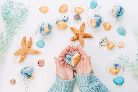 Close up of woman holding ornament with gold seashell and blue moss on white background. Christmas tree decor idea. Top view, flat lay.