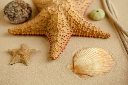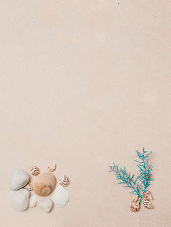 sea shells on beach sand background, with branches of plants, seashell, top view