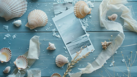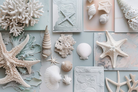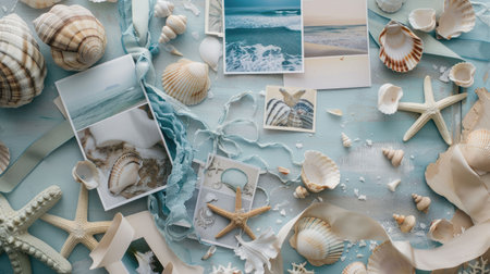 Various sea-inspired decor elements arranged elegantly against a light blue background, including shells, miniature sailboats, and candles. This setup evokes a coastal vibe. Mood board