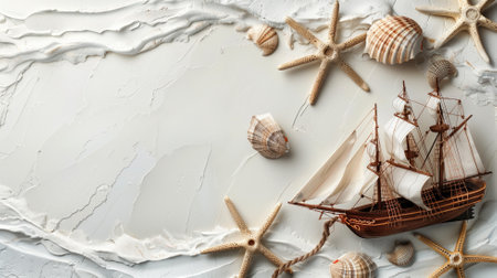Miniature sailboat model on textured surface with starfish and shells creating nautical theme