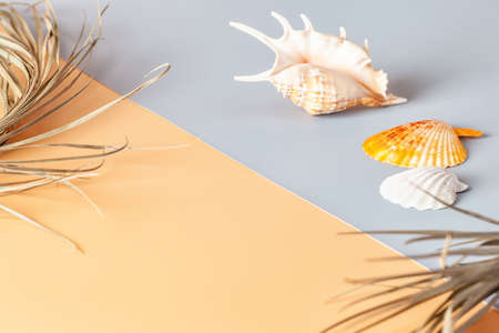 Summer composition. Seashells and dry palm leaves. Copy space.