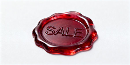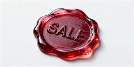 Close-up of a red wax seal with the word SALE embossed, resting on a clean white surface. Represents discounts, promotions, and special offers in retail or marketing.