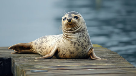 A charming seal lounges on a wooden dock, embodying the peacefulness of coastal wildlife. The serene water creates a calming backdrop, emphasizing nature's beauty.