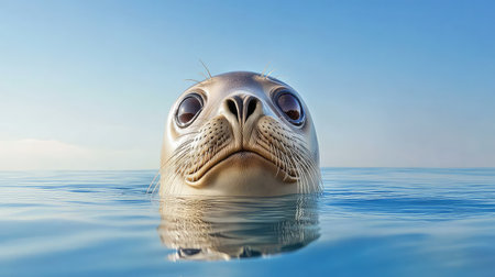 A captivating portrait of a playful seal swimming just beneath the surface of clear ocean waters under a bright blue sky, capturing the essence of marine wildlife.