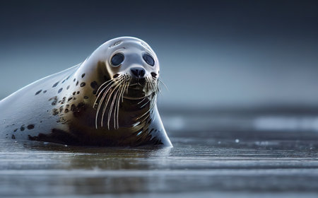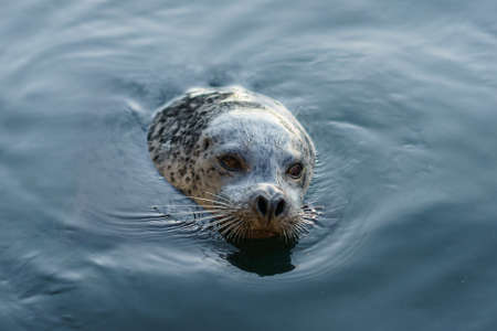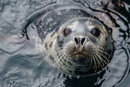 Harbor seal peeking out of the water with captivating eyes and sensitive whiskers