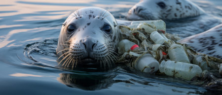 Seals swimming near the shore, visibly affected by nearby plastic pollution,
