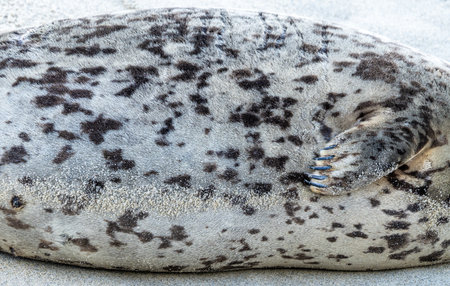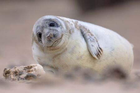 A gray seal on the beach in norfolk, england on a sunny day, close up. high resolution wildlife photography
