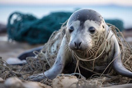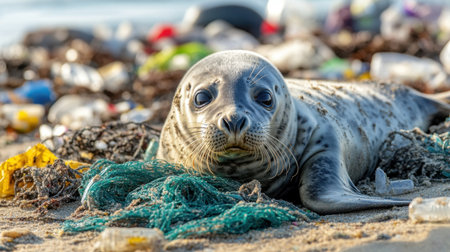 A grey seal lies stranded on a beach, tangled in a fishing net amidst plastic waste, a heartbreaking reminder of pollution's impact on wildlife.