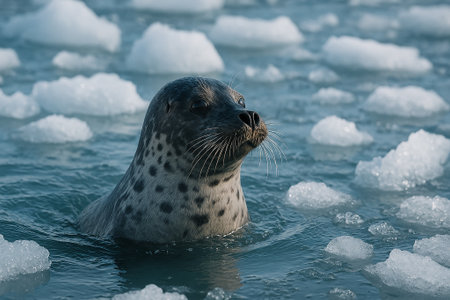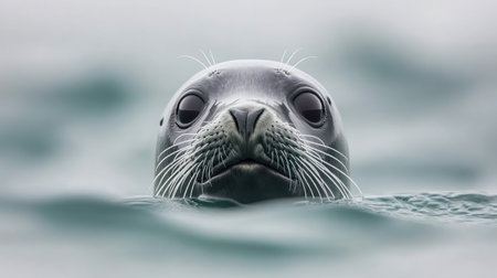 Close-up of a wild seal surfacing gracefully in icy ocean water, observing its cold natural habitat, captured in a serene wildlife photograph.