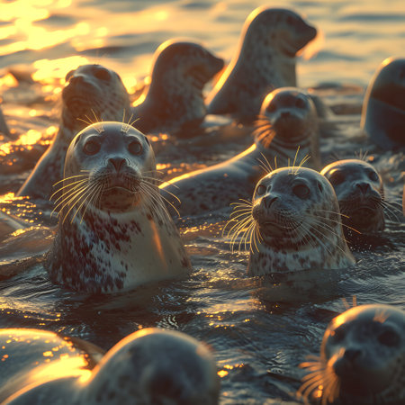 Seal family in the ocean water with setting sun shining. Group of wild animals in nature.
