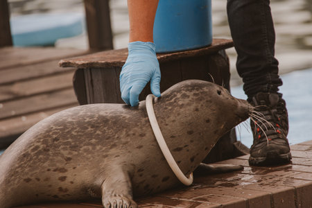 Seal in the wild near the water, an animal of the seal family in captivity on rehabilitation in the reserve. common seals (Phoca).