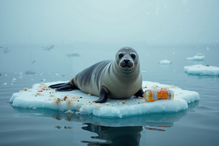 sea lion lying on an ice floe with trash garbage beside