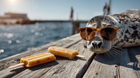A charming seal wearing sunglasses lounges on a dock, featuring two delicious ice cream treats beside it. The serene ocean backdrop enhances the delightful summer vibe.