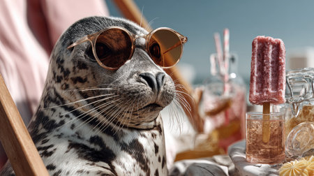 A charming seal is lounging in style on the beach with trendy sunglasses, enjoying the summer atmosphere alongside delicious treats, embodying pure bliss.