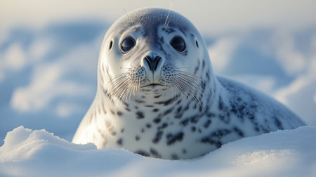 A sleek spotted seal peeks above icy waters, looking directly at the camera with curious eyes.