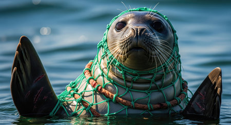 A distressed seal swims in the ocean, trapped and struggling in a green fishing net, highlighting environmental pollution. Close up view shows deep concern.
