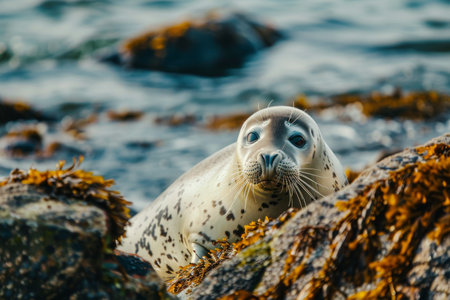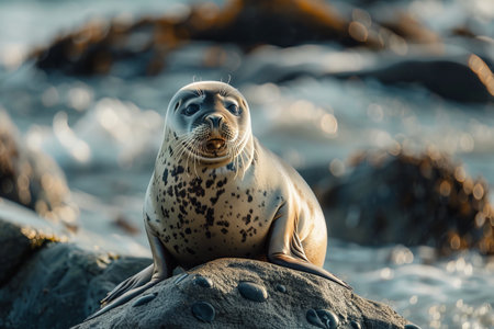 Spotted seal basking on a rock amidst a serene coastal setting.