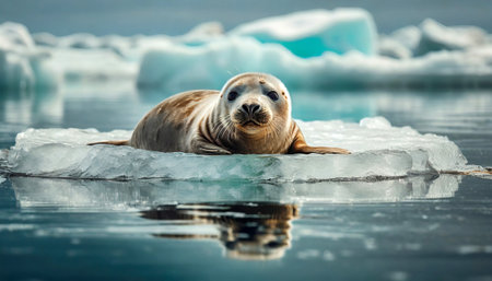 Baby seal floating on melting ice sheet, global warming and climate change concept, generative ai illustration