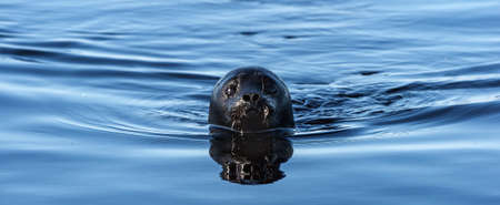 The Ladoga ringed seal swimming in the water. front view. blue water background. Scientific name: Pusa hispida ladogensis. The Ladoga seal in a natural habitat. summer season. Ladoga Lake. Russia