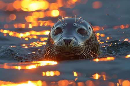 A closeup of the head and shoulders above water, a harbor seal swimming in byak balearwite sea at dawn. the sea is calm with gentle ripples on its surface. sunlight reflects off it's wet fur as he swimes towards camera.